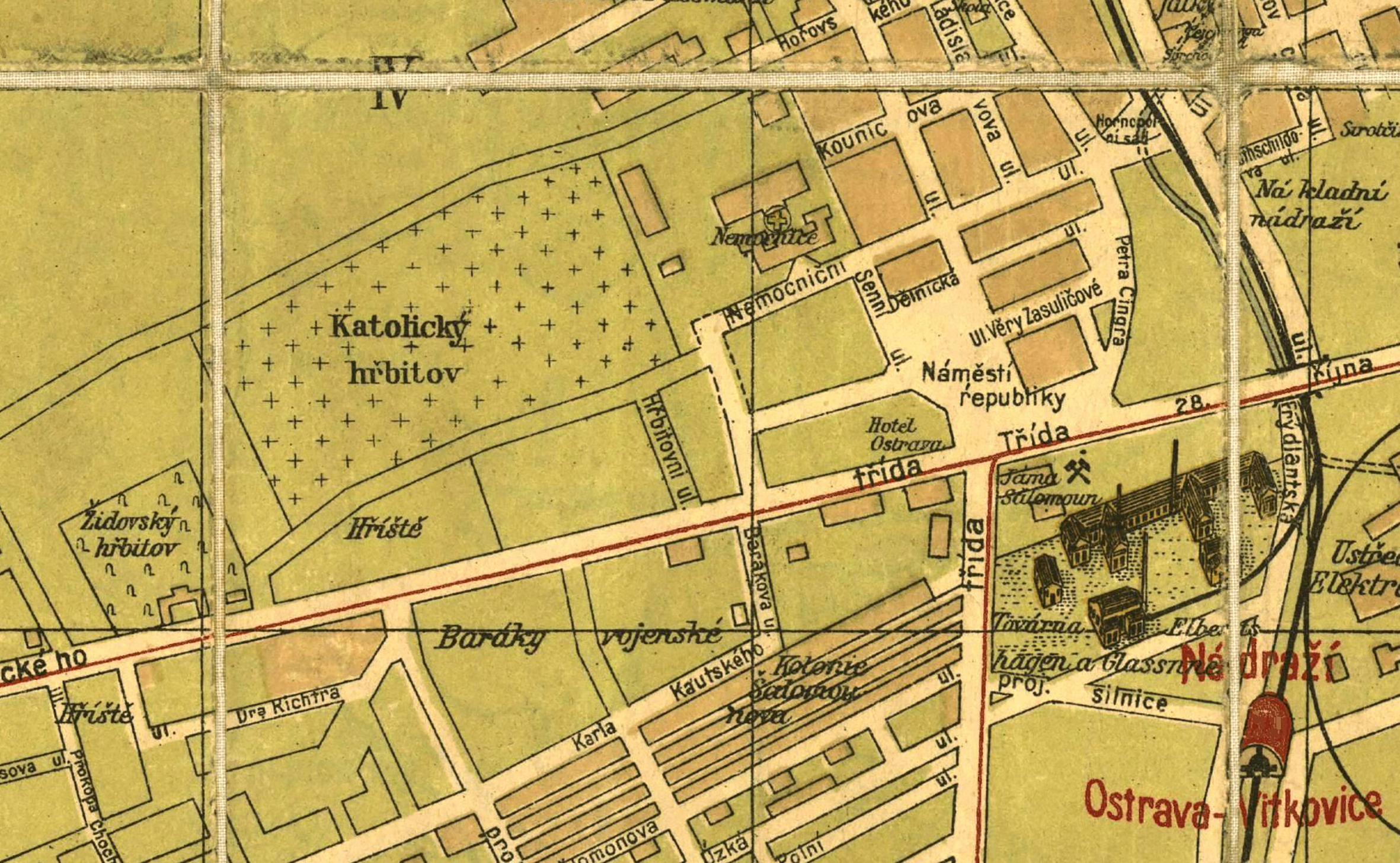 Městský hřbitov – Pro krematorium bylo určeno místo v západní části městského hřbitova (dnešní sad Dr. Milady Horákové) při ulici 28. října.
