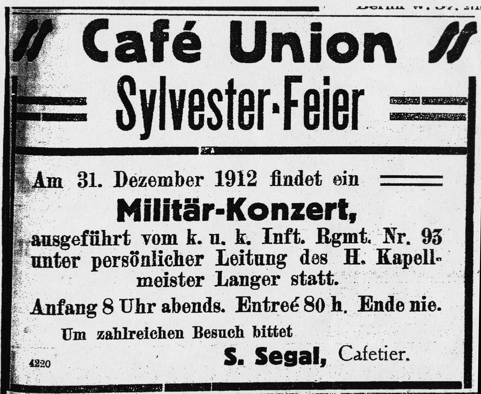 Reklama na silvestrovskou oslavu 31. 12. 1912 v kavárně Union v Moravské Ostravě