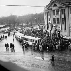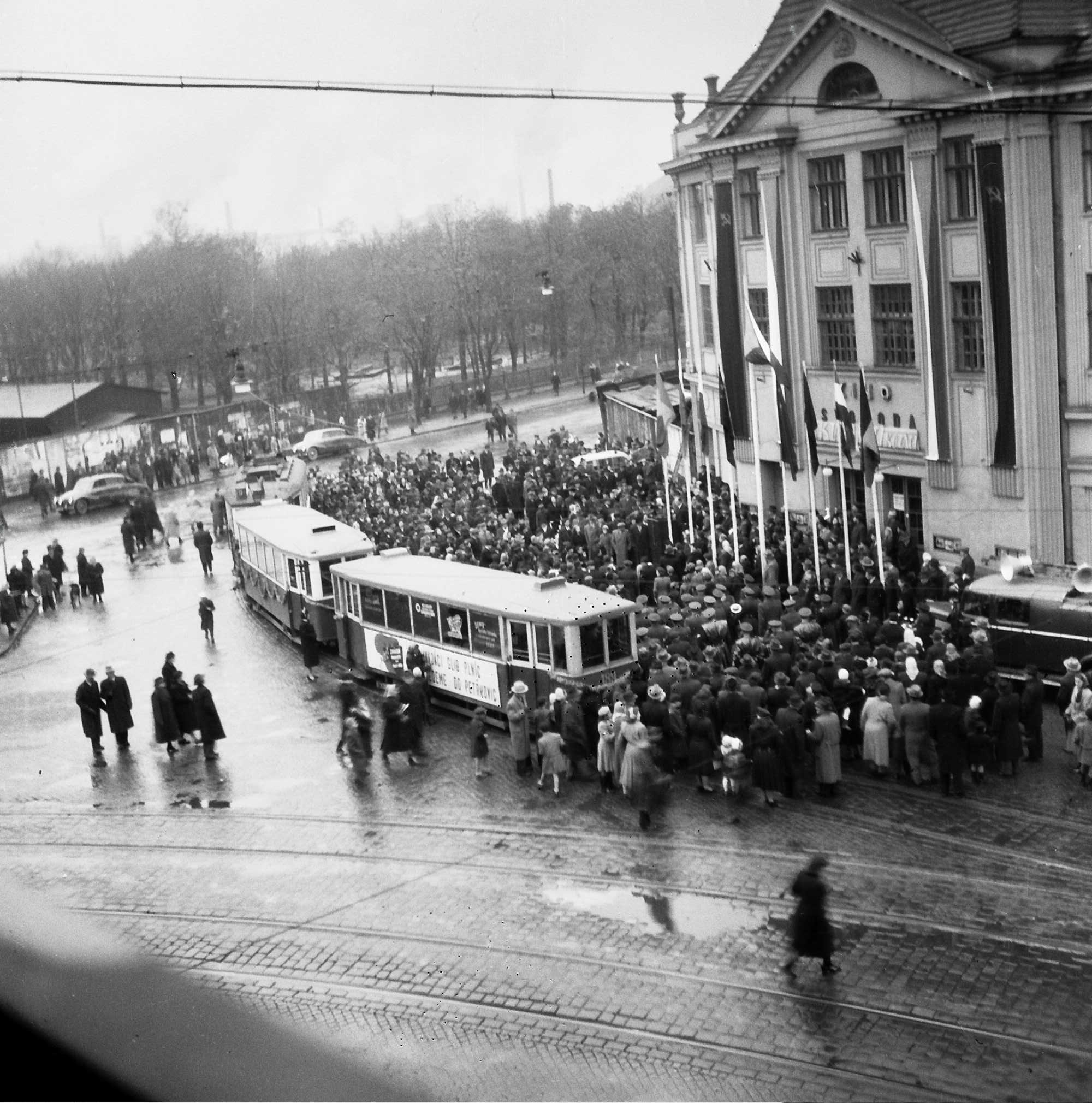 Trať Míru, první jízda tramvaje č. 17 na trati Vítkovice-Petřkovice, snímek z trati u kina Svoboda v Ostravě-Přívoze, 1950