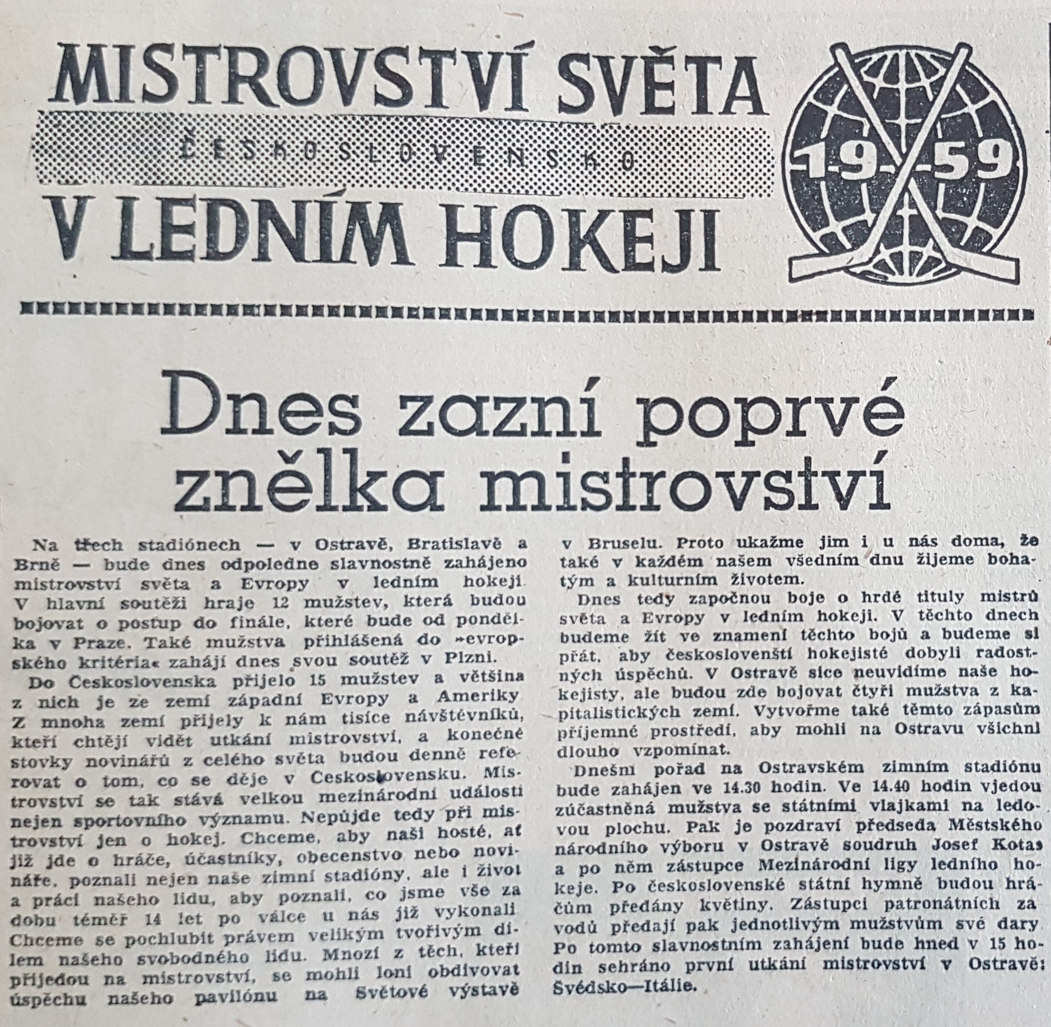 Nová svoboda, 5. 3. 1959, v úvodní den šampionátu skončila ostravská utkání Švédsko-Itálie 11:0 a Finsko-NSR 5:3.