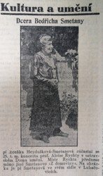 Zpráva v Moravskoslezském deníku informující o tom, že na koncertu 25. 5. 1932 v Domě umění bude přítomna dcera skladatele B. Smetany, Z. Heydušková-Smetanová.