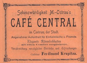 Reklama na kavárnu Central krátce po jejím otevření, kdy ji vedl Ferdinand Krupitza.