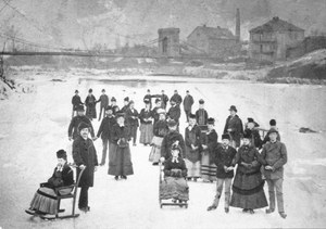 Foto 1: Ostravští bruslaři na přírodním kluzišti na zamrzlé Ostravici koncem 70. let 19. století.