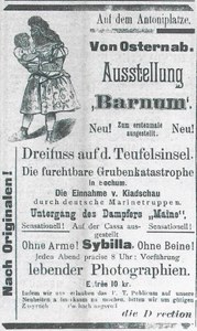 Tehdy se na Antonínově náměstí v Moravské Ostravě konalo předvádění „živých fotografií“, jak se tehdy říkalo prvním kinematografickým představením. Blíže nejmenovaná společnost zde uvedla francouzské filmy, mj. dvouminutový snímek „Výbuch křižníku Maine v havanském přístavu“ – „Quais de La Havane (Explosion du cuirassé Le Maine)“ natočený vizionářským režisérem G. Mélièsem, jehož vrcholem byl záběr pořízený přes akvárium, tak aby bylo dosaženo dojmu, že byl natáčen na mořském dně. Dále se promítal také aktuální snímek „Dreyfus na Ďábelských ostrovech“ a další.