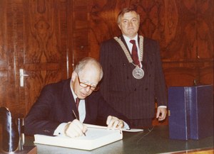 Foto1: Jacob Rothschild se podepisuje do pamětní knihy, vedle něj primátor Ostravy Jiří Smejkal
