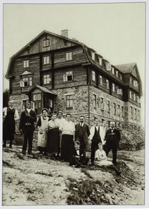 Foto: Personál turistického hotelu vítkovické sekce Beskidenvereinu na Bílém kříži po jeho otevření v září 1924