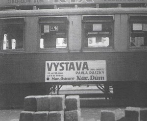 Foto1: Reklama na tramvaji zvoucí na výstavu P. Raszky, která se konala 10. – 30. 10. v Národním domě, dnes divadlo J. Myrona (rodinný archiv).
