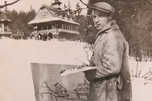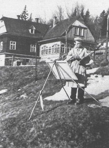 Foto2: Častým tématem maleb P. Raszky byla krajina Beskyd. Zde při práci pod horským hotelem Skalíkova louka (rodinný archiv)