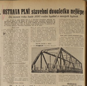 Právě tehdy vyšel v Nové svobodě článek vyzdvihující rychlost stavebních prací na výstavbách nových obytných prostor v Ostravě. Poukázáno bylo zejm. na výstavbu nových bytů v Přívoze, rozestavěných stavbách v Muglinově, Hrabové a Kunčicích. Výstavba probíhala i v oblasti veřejných pozemních staveb jako např. kotelna a několik nových pavilonů v městské nemocni, školní budovy v Zábřehu, Slezské Ostravě a Radvanicích. Článek rovněž poukazoval na výstavbu pozemních komunikací mj. v Heřmanicích a Staré Bělé a mostů (např. most spojující Vratimov a Kunčičky).