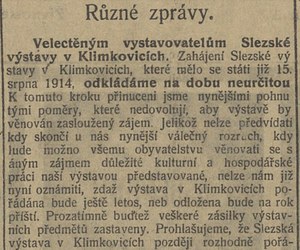 Foto1: Novinový článek k odložení Slezské výstavy, Ostravský kraj 1914