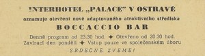 V pondělí 1. 9. 1969 byl po rekonstrukci Interhotelu Palace na Gottwaldově třídě (dnes 28. října) znovu otevřen pro veřejnost také exkluzivní noční bar Boccaccio, jehož tradice zde trvala již od dob 1. Československé republiky. Původní kapacita byla po rekonstrukci radikálně snížena téměř o polovinu – z 240 na 130 míst. Moderní interiér byl realizován podle návrhu ostravského architekta Richarda Habarta. Vzhledem k tomu, že se jednalo o podnik nejvyšší cenové kategorie, návštěvníci museli platit na svou dobu značně vysoké vstupné 50,-Kč (dnes by to bylo vzhledem ke srovnání cen hrubým odhadem tisíc korun), do něhož však byla započtena i konzumace jídla a pití v poloviční hodnotě. Pro pobavení hostů byl k dispozici varietní program, který se skládal z několika tanečních čísel a obsahoval dokonce i striptýzové vystoupení. Poslední položka však byla vzhledem k nastupující normalizaci z programu brzy odstraněna.