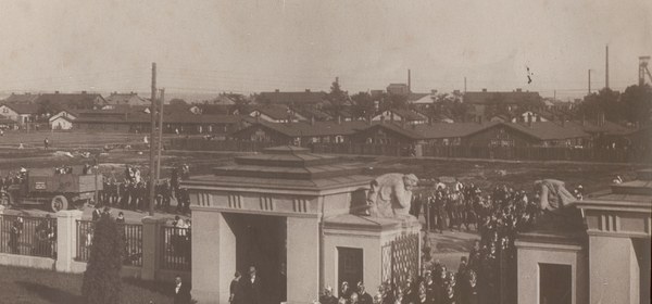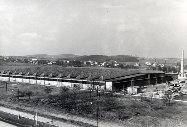 Pohled na vozovnu pro elektrické tramvaje v Porubě v roce 1960, v pozadí rodinné domky v Pustkovci.