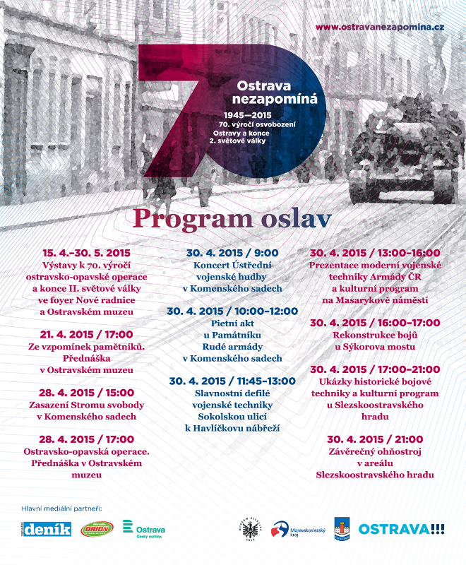 I když od těchto událostí uplynulo již dlouhých 70 let, na statečnost a odhodlání osvoboditelů Ostrava nezapomíná. Spolu s Moravskoslezským krajem, krajským vojenským velitelstvím a kluby vojenské historie připravila k oslavě výročí pestrý a atraktivní program. Ten vyvrcholí ve čtvrtek 30. dubna pietním aktem v Komenského sadech a akcemi na Masarykově náměstí a u Slezskoostravského hradu. K vidění bude slavnostní defilé a prezentace historické i současné vojenské techniky, rekonstrukce bojů, kulturní vystoupení. Podrobnosti na stranách 8 a 9. (bk)