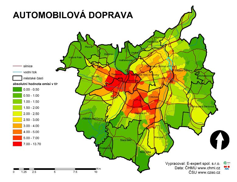 Emise TZL z automobilové dopravy byly stanoveny z údajů poskytnutých ČHMÚ – z plošně vyjádřených emisních toků ve čtvercích o straně 1 km. Použité emisní toky zahrnovaly primární emise ze spalování paliv, otěrů pneumatik a brzdových destiček a abraze vozovky. Podle očekávání se znečištění z dopravy koncentruje v blízkosti křížení dopravně nejzatíženějších komunikací (1).