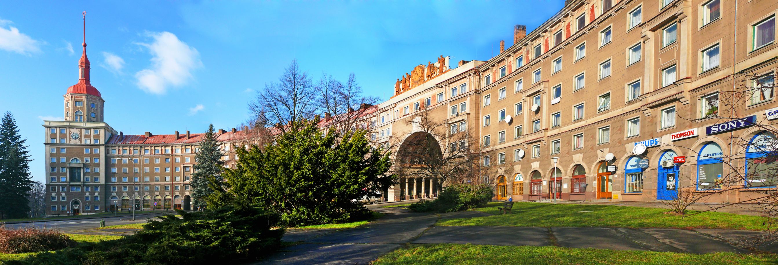 Monumentálním obloukovým průchodem se dostaneme z náměstí na Hlavní třídu, kterou přejdeme na druhou stranu a protějším obloukovým průchodem vejdeme opět na Havlíčkovo náměstí. V jeho horní části se malým průchodem v domovním bloku opět, už po modré pásové značce, dostaneme k cíli našeho putování – k restauraci Slovan.