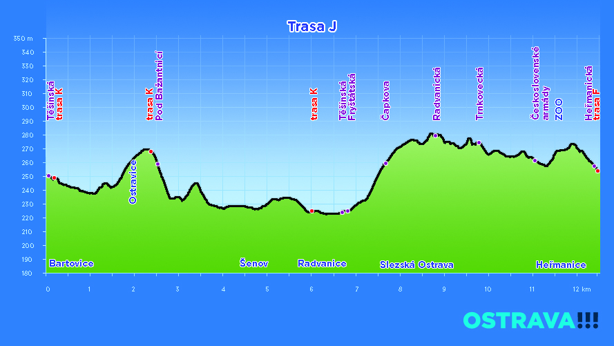 Vyznačen je úsek trasy J po ul. Koněvově, Stromovka, Michálkovické a Pikartské, kde naváže na realizovaný úsek od hranice městských obvodů Slezská Ostrava, Radvanice a Bartovice v blízkosti VVUÚ. Trasa vede po ul. Radvanické a Rokycanově k ul. Vrchlického a Těšínské (v opačném směru vede trasa ul. Dalimilovou). Od rondelu v Radvanicích se trasa stáčí k ul. Na Hrázkách a podél ul. Rudné vede trasa do dolní části Bartovic. Ul. Bartovickou a Nad Lučinou míří trasa ke křižovatce s trasou K u statku v Bartovicích. Po ul. U Statku vede trasa na katastr Šenova, kde je možné buď pokračování zpět k areálu Ještěrka v Bartovicích po ul. Na Hrázkách nebo po ul. Vráclavské k městskému úřadu v Šenově, kde se nachází křížení s trasou 6063 (směr Petřvald, Václavovice).