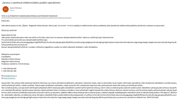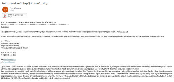 Doručení e-mailové datové zprávy se odesilateli potvrzuje, pokud je možné z přijaté datové zprávy zjistit elektronickou adresu odesilatele. Zpráva je elektronicky pečetěna kvalifikovanou elektronickou pečetí statutárního města Ostrava. Součástí zprávy o potvrzení doručení je: