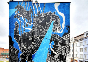 Since the end of September, Ostrava’s people have been able to enjoy a mural designed by the Polish artist Mariusz Waras. This huge outdoor wall painting is entitled JUMP, and it was inspired not only by Ostrava’s visual aesthetics, but also by the city’s history, architecture, and local legends. Work on the mural took 6 days, and it covers a total surface of 220 square metres. The painters used over 200 cans of spray paint to create the image.