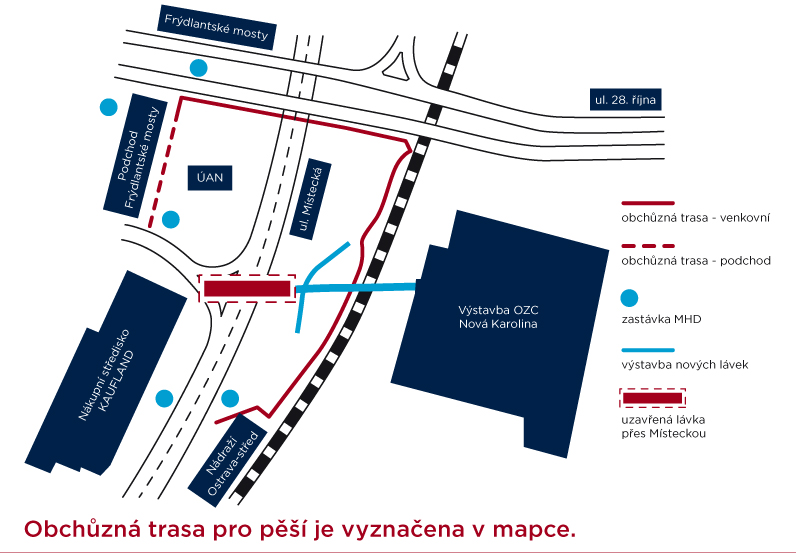 Po celou dobu demolice a výstavby lávky bude provoz pro pěší přes silnici Místeckou uzavřen. Chodci budou směrováni na ulici 28. října a podchodem Frýdlantské mosty. Více najdete v letáku zde a na přiložené mapce: