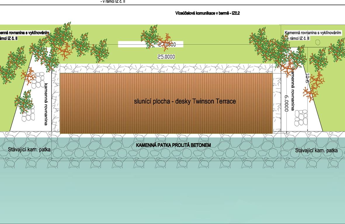 Vše doplní tři slunící plochy. Jsou navrženy mezi spodním stupněm (pod lávkou na Kamenec) a pěší lávkou u Památníku rudoarmějců, z toho dvě na levém břehu v přímé vazbě na Komenského sady a jedna na pravém (slezském) břehu v sousedství sídliště na Kamenci. Tyto plochy poslouží jako zastávky pro vodáky. Hlavním prvkem této plochy bude plató celkových rozměrů 5 x 25 metrů z voděodolných desek na bázi dřeva a PVC. Všechny stavby zajistí vítězná firma ve výběrovém řízení Eurovia.