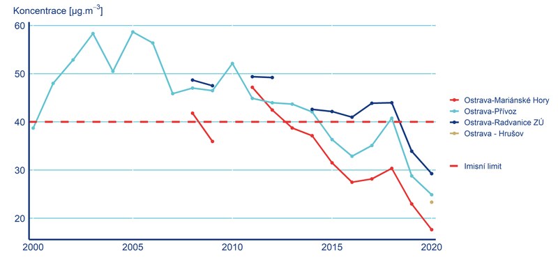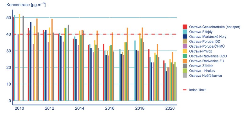 V roce 2020 v Ostravě pokračoval dlouhodobý trend zlepšování kvality ovzduší, kdy byly naměřeny historicky nejnižší průměrné koncentrace polétavého prachu. K meziročnímu zlepšení kvality ovzduší došlo na všech ostravských měřicích stanicích a na žádné z nich nebyl překročen roční imisní limit pro prachové částice PM10.