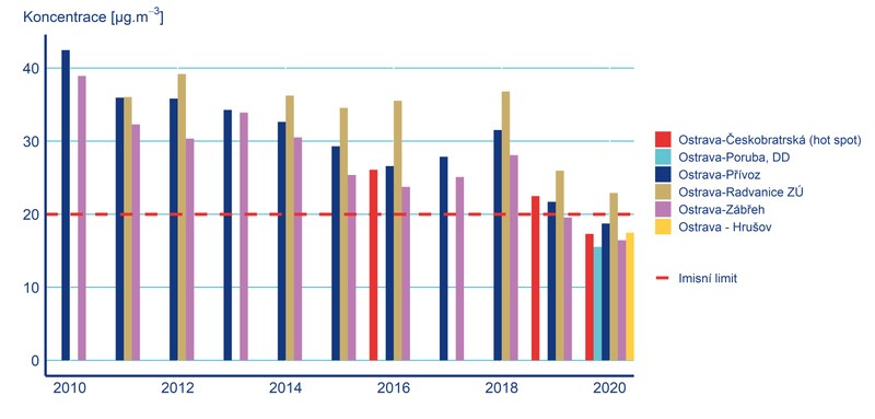 Průměrné roční koncentrace PM2,5 v Ostravě, 2010–2020: