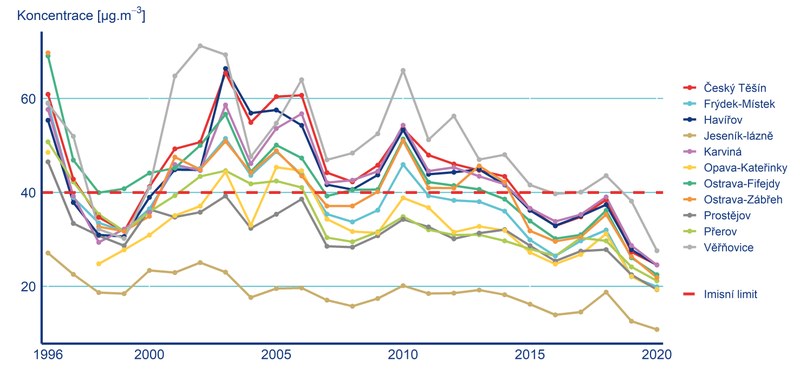 Vývoj průměrných ročních koncentrací PM10 v letech 1996–2020 na vybraných stanicích Státní sítě imisního monitoringu: