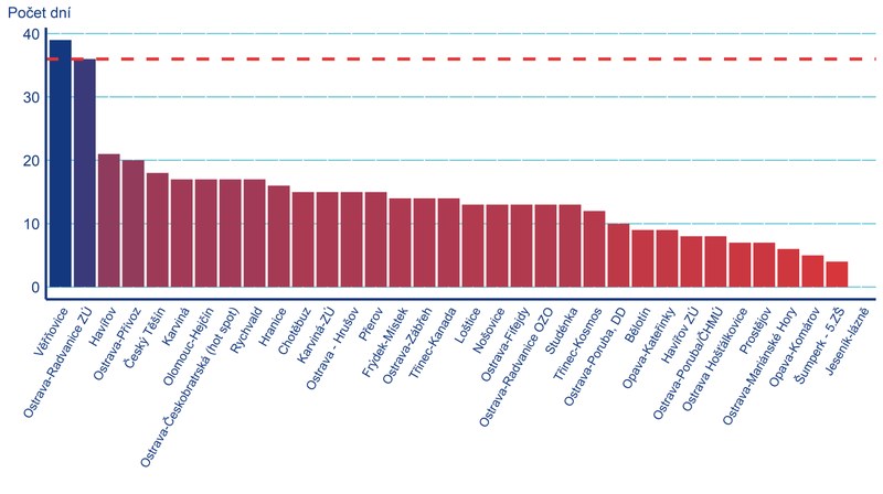 Počet dní s průměrnou nadlimitní denní koncentrací PM10 v roce 2020 v Moravskoslezském a Olomouckém kraji (imisní limit = 50 µg.m-3). Tolerovaný počet dnů s překročením v roce je 35: