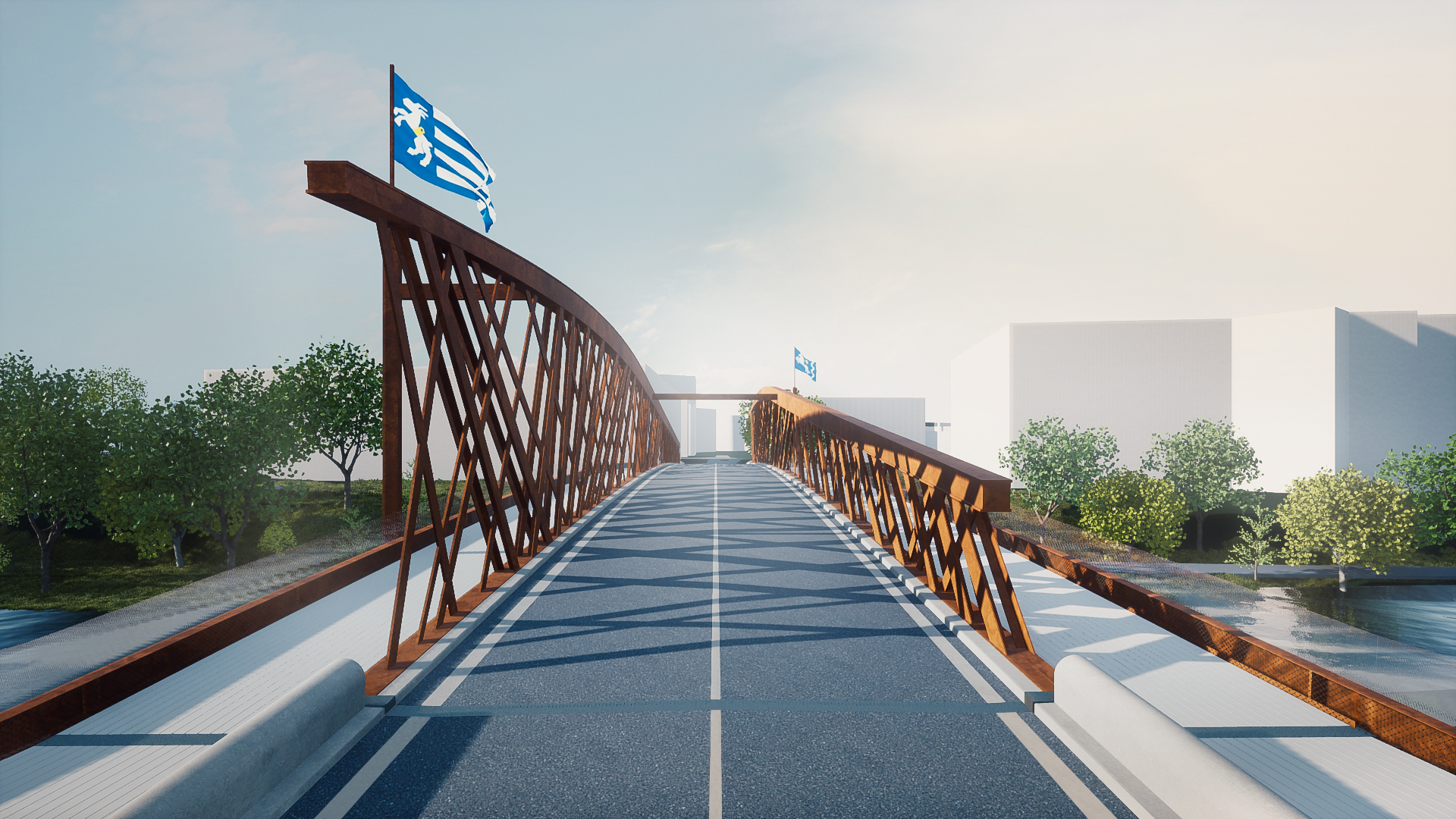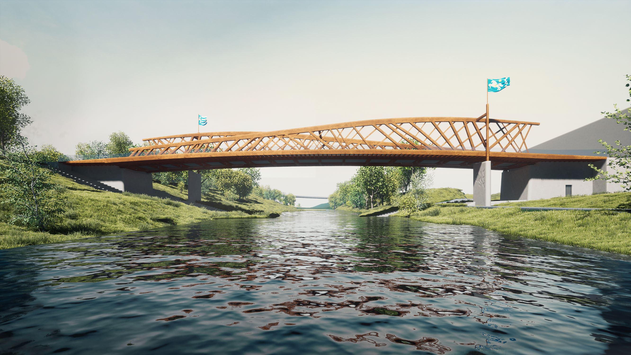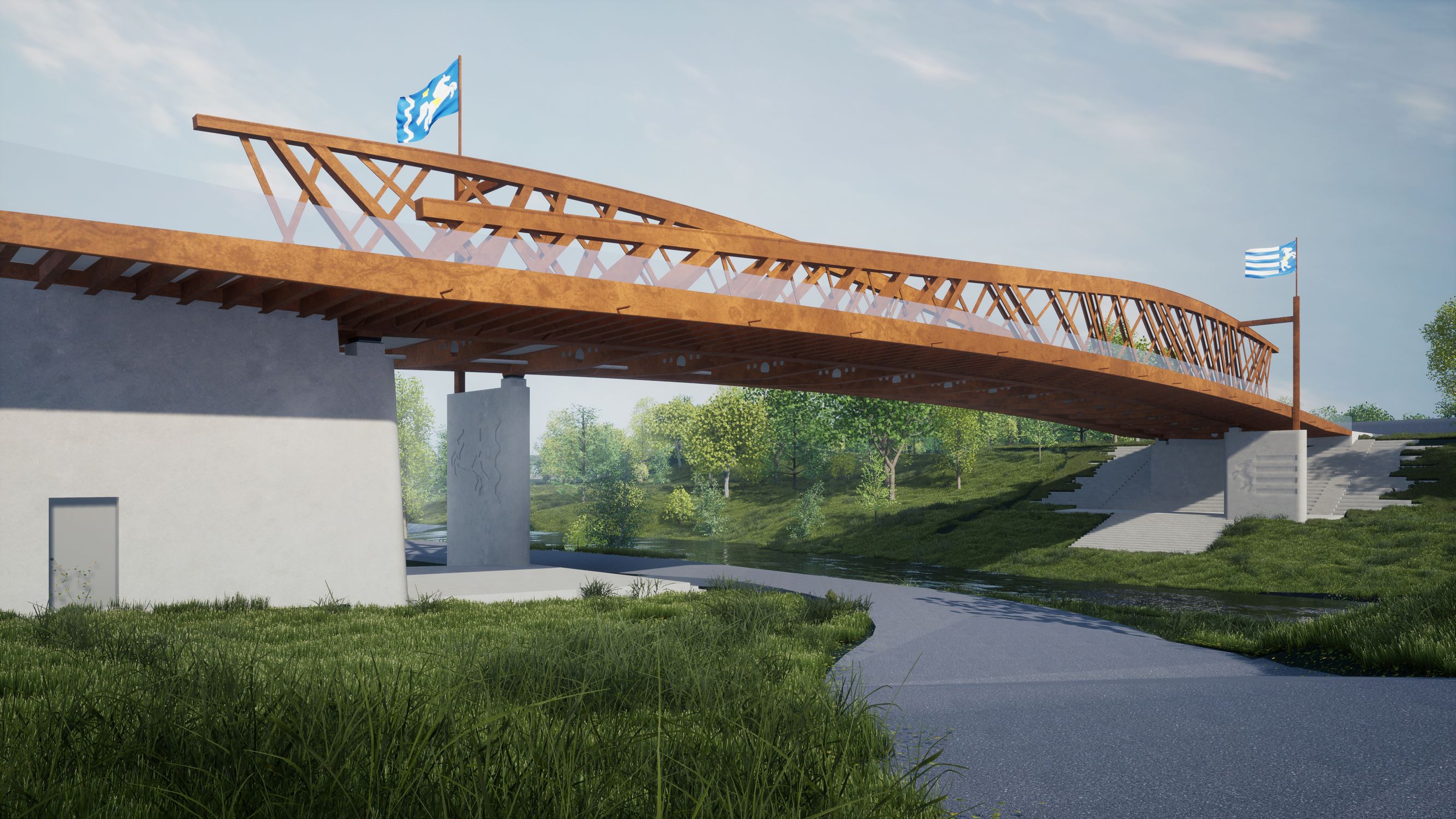 Hlavní nosníky jsou v místě podepření pilířem, vždy 10 m od opěry, zajištěny proti vybočení rámem překračujícím chodník a kotveným do pilíře. Konstrukce tak vytváří dvě výrazné brány/věže, vždy na příslušném břehu. Tyto body jsou věnovány městským znakům s výraznými motivy „koníka a kamzíka“. Brány budou doplněny výtvarnými díly na pilířích obou nábřeží a vysokými stožáry. Dvě velké vlajky vlající z břehových pilířů nad oběma hlavními nosníky, dodávají mostu pohyb a živost.