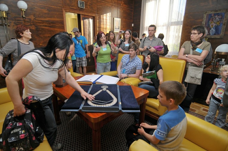 A co mohli návštěvníci vidět a zažít? Po skupinách si za výkladu průvodce prohlédli reprezentativní prostory budovy radnice včetně pracovny primátora. Podívali se do míst, která nejsou veřejnosti běžně přístupná a dozvěděli se zajímavosti z historie i současnosti tohoto výjimečného objektu. V jedné z reprezentativních prostor radnice – v obřadní síni – si zájemci mohli v minikoncertech vyslechnout známé muzikálové melodie a slavné skladby v podání mladých zpěváků z Fakulty umění Ostravské univerzity Soni Jungové a Petra Volného za klavírního doprovodu Lukáše Michela.