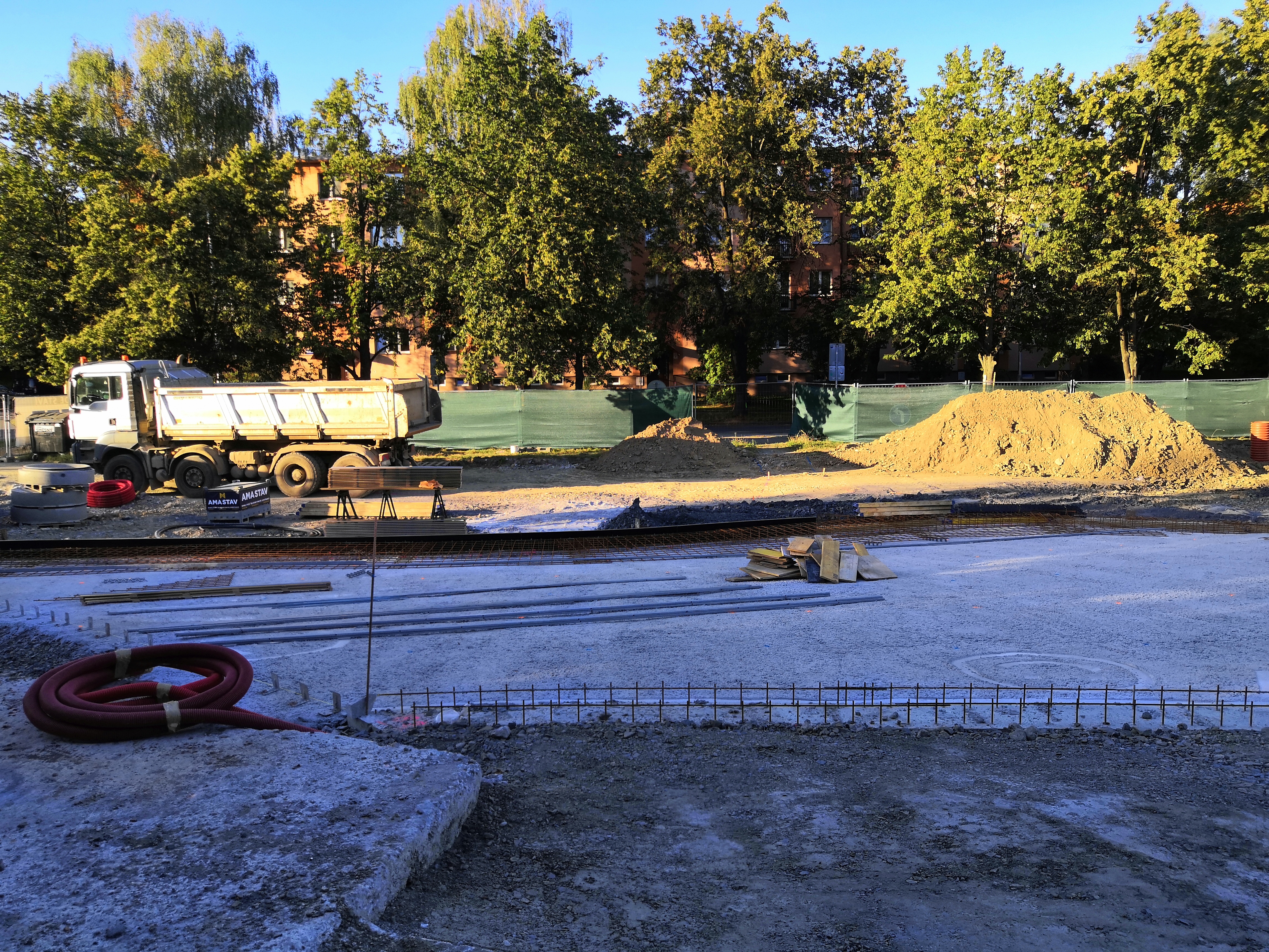 K dokončení tedy zbývá začít po vyztužení s postupnou betonáží jednotlivých ploch. Ty budou rozděleny do jednotlivých výškových úrovní, přesněji řečeno dilatačních celků. Nejdříve bude provedena horní deska, následně po provedení reliéfního obloukového bednění postupná náročná betonáž jednotlivých stupňů schodiště. Na tento postup naváže rozšíření parkoviště, budování prostoru malé vodní plochy – kaluže, do které bude převedena voda z vodního prvku a následně betonáže spodní plochy kolem vodního prvku a návazností na okolní plochy.