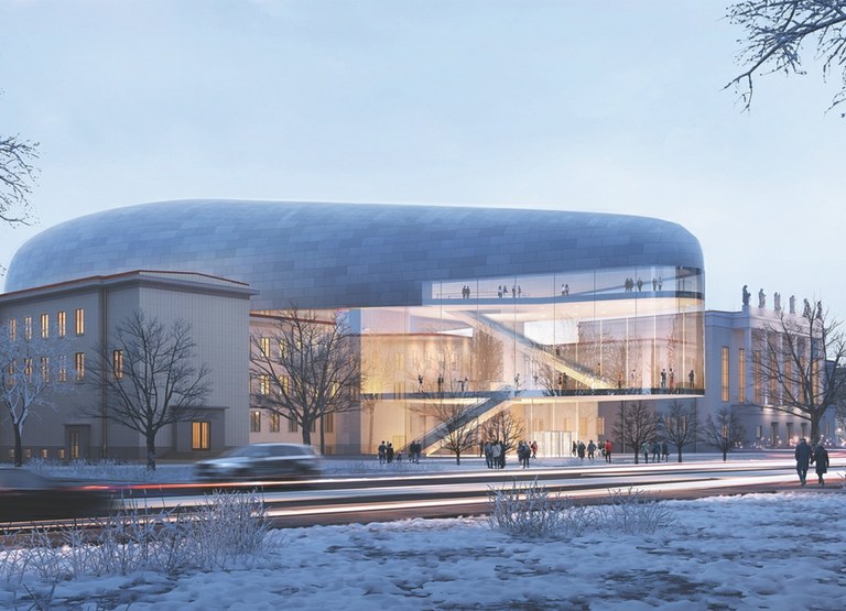 Nová koncertní hala bude propojena s Domem kultury města Ostravy. Vizualizace: Steven Holl Architects