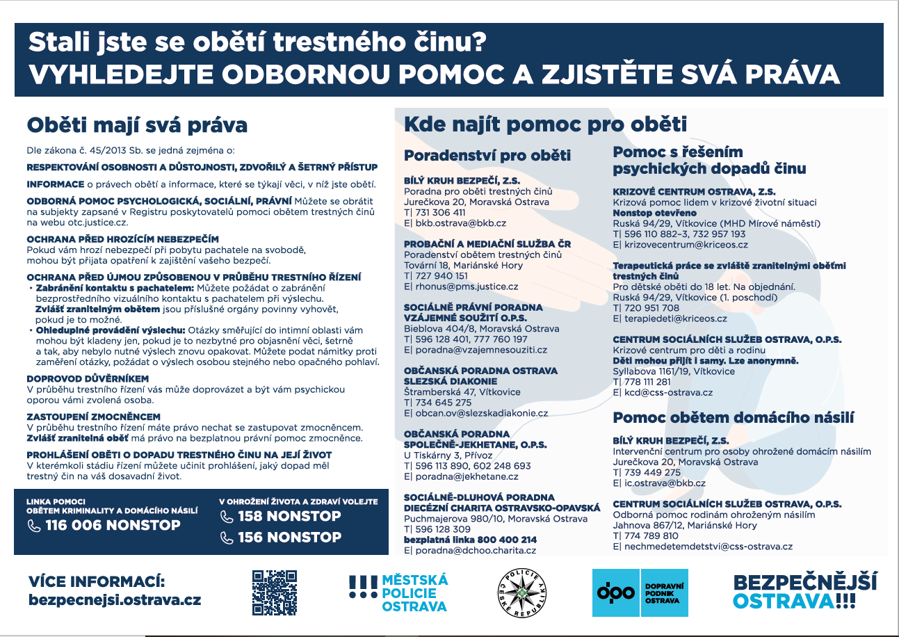 Informace o možnostech pomoci obětem, spolu s příslušnými kontakty, však obsahují také tiskoviny města. Spolupracující subjekty využívají ve své práci letáky se základními informacemi, potřebné informace nabízí též plakáty, dostupné na infotabulích Městské policie Ostrava. Částkou přesahující 1.3 milionů korun podpořilo vloni město aktivity určené obětem – poradenství, terapeutickou práci se zvlášť zranitelnými oběťmi, činnost Intervenčního centra pro osoby ohrožené domácím násilím a zajistilo i vzdělávací kampaň pro pracovníky, kteří jsou v první linii kontaktu s potenciálními oběťmi (zdravotníci, školská zařízení, sociální služby a další...).