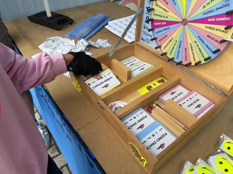 Ve stánku BESIP si děti mohly zatočit kolem štěstí, které jim vybralo jednu z mnoha zapeklitých otázek na téma bezpečnosti silničního provozu. Za odměnu si mohly vybrat jeden z mnoha reflexních bezpečnostních prvků, třeba hvězdičku, smajlíky či pásky.