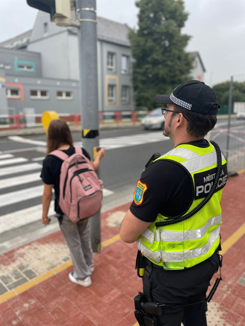 Strážníci dohlíželi na bezpečnou chůzi po chodníku i přecházení přes přechod pro chodce před zahájením vyučování.