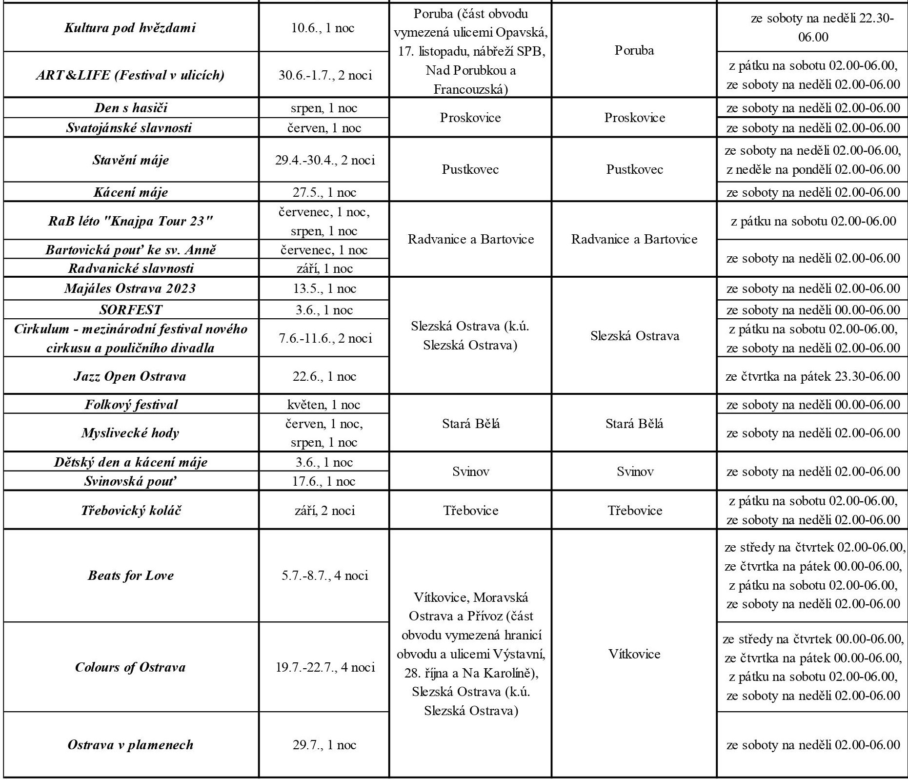Obecně závazná vyhláška o nočním klidu byla zastupiteli města vydána v lednu tohoto roku a v příloze definovala 39 společenských a kulturních akcí, při jejichž konání se zkracuje doba nočního klidu oproti zákonnému rozmezí od 22 hodin do 6 hodin. Zastupitelstvo na svém květnovém zasedání doplnilo seznam o další dvě akce: tradiční Jazz Open Ostrava a proskovické Svatojánské slavnosti.