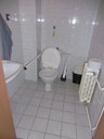 V prostoru Rozloučení v úzkém rodinném kruhu se v jeho zadní části nachází samostatná částečně upravená toaleta (dveře šířky 81 cm otvíratelné ven, kabina šířky 136 cm, hloubky 157 cm, výška záchodového prkénka 50 cm). Šířka kabiny je zúžena tělesem (radiátor) na vytápění na 119 cm. Přístup k míse z pohledu od vstupu do kabiny je zprava nedostatečný (73 cm), blokován napevno osazeným radiátorem. Mísa WC je opatřena jedním pevným madlem (délka 103 cm, výška 64 cm) a jedním sklopným madlem (délka 102 cm, výška 70 cm), osová vzdálenost 58 cm). Kabina je uzamčená, přístup na požádání zajistí personál Krematoria. Dveře do WC nejsou opatřeny z vnitřní strany madlem. Umývadlo je opatřeno ventily (kohoutky) na teplou i studenou vodu. V místnosti se nachází odpadkový koš, toaletní papír, mýdlo a ručník v dosažitelné vzdálenosti. V době mapování bylo pravé sklopné madlo vyviklané s povytaženými šrouby. Přístup ke dveřím kabiny a jejich otevření ztěžuje šířka přístupové chodby (nutno otočit se o 90° v prostoru o šířce pouze 136 cm).