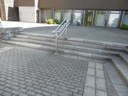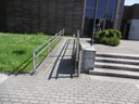Plocha před vstupy do Velké obřadní síně („Čekárny pro smuteční hosty“, „Čekárny pro nejbližší rodinu“ a prostor „Rozloučení v úzkém rodinném kruhu“) je přístupná schody (4 stupně) nebo jednoramennou rampou (sklon 10%, průjezdná šířka 150 cm, délka 685 cm), která se nachází po levé straně schodů. Její povrch tvoří zámková dlažba. Rampa je opatřena oboustranným zábradlím s dvěma madly nad sebou (výška 91 cm a 70 cm) i zarážkou proti vyjetí. Manipulační prostor pod i nad rampou je dostačující.