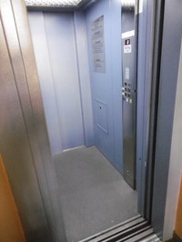 Hlavní výtah (automaticky otevíratelné dveře šířky 80 cm, kabina šířky 110 cm, hloubky 142 cm) se nachází ve výklenku (šířka 104 cm, hloubka 29 cm) je průchozí a přístupný z chodby a vedlejšího vstupu. Je vybaven madlem na boční stěně (ve výši 110 cm), zrcadlem na boční stěně (ve výši 124 cm) a sklopným sedátkem. Ovladač na nástupních místech (ve výši max. 124 cm), ovladače uvnitř kabiny (ve výši max. 117 cm). Výtah spojuje suterén až 3. patro. Manipulační prostor před výtahem je dostatečný.