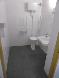 Upravené WC: v době mapování pravé madlo vyviklané; nevhodné velké zdravotní umývadlo - mezi WC mísou a umývadlem prostor pouze 30 cm; splachování řešeno šňůrkou (výška 136 cm) umístěno na straně, kde není přístup; pro osoby na vozíku nedosažitelné.