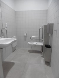 Volně přístupná upravená kabina se nachází v 1.NP u knihovny. Do samostatné kabiny (šířka 162 (143) cm, hloubka 267 (223) cm) se vstupuje jednokřídlými dveřmi, které se mechanicky otevírají ven (průjezdná šířka 80 cm, bez prahu). Na dveřích se z vnější strany nachází piktogram vozíku a dveře nejsou z vnitřní strany opatřeny madlem. WC mísa (výška sedátka 41 cm) je osazena na pravé stěně u protější stěny z pohledu od vstupu. Přístup zprava je dostatečný (221 cm). Odsazení přední hrany WC od zadní stěny je 70 cm. Mezi čelem mísy a otopným tělesem je 63 cm. Mísa WC je opatřena sklopným (délka 60 cm, výška 64 cm) a pevným madlem (délka 60 cm, výška 73 cm, osová vzdálenost 62 cm). Splachování WC se nachází vzadu na stěně (výška 104 cm). Zdravotní umyvadlo (výška 80 cm) je opatřeno pákovou baterií a zrcadlem (výška spodní hrany 92 cm). Podjezd umyvadla je dostatečný. Kabina je vybavena odpadkovým košem s podjezdem, toaletním papírem, mýdelníkem (výška 103 cm), papírovými ručníky (výška 103 cm) a věšákem (114 cm).