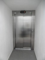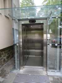 Výtah má před venkovním vstupem dostatečný manipulační prostor. Výtah je průchozí, druhé dveře jsou umístěny na čelní stěně a spojuje 1. PP až 3. NP (0, 1, 2, 3). Šachetní i klecové dveře se otevírají automaticky do stran (průjezdná šířka 90 cm) a uvnitř budovy jsou umístěny v nice-výklenku (šířka 120 cm, hloubka 52 cm). Ve výtahové kleci (šířka 110 cm, hloubka 140 cm) je na boční stěně umístěno madlo (výška 92 cm, odsazení madla od stěny 8,5 cm) a zrcadlo (výška 95 cm). Výška ovladače v nástupních místech je 110 cm, výška horního tlačítka uvnitř klece je 105 cm.