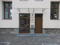 Hlavní vstup je bariérový zvenku +12 schodů v zádveří dalších +6 schodů. Zadní vstup je také bariérový. Před vstupem je dostatečný manipulační prostor a před vstupními dveřmi je osazena čisticí zóna (ocelový rošt). Dvoukřídlé, vstupní dveře se mechanicky otevírají směrem ven (průjezdná šířka hlavního křídla 86 cm, práh 2 cm). V zádveří se nachází +6 schodů. Bezbariérový vstup umožňuje venkovní průchozí výtah, který je přistavěn k budově v blízkosti zadního vstupu. Před vstupem do výtahu je zapuštěný kovový čisticí rošt. Přístupovou komunikaci od cesty k výtahu tvoří betonová dlažba s kamennou kostkou se sklonem místy až 8%.