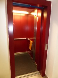 Výtah samoobslužný s vyhovujícími parametry se nachází vpravo za informacemi (automaticky otevíratelné dveře šířka 80 cm, klec šířka 110 cm, hloubka 140 cm) je vybaven madlem (výška 92 cm) a sklopným sedátkem. Ovladač na nástupních místech je ve výšce max. 100 cm, maximální výška ovladačů uvnitř klece je 113 cm. Výtah spojuje přízemí až 2. patro. Manipulační prostor před výtahem je dostatečný.