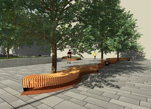 Plocha předprostoru Pokladu bude tvořena novou velkoformátovou dlažbou, obnovena bude zeleň, doplněn mobiliář i terasa pro vnitřní restauraci.
