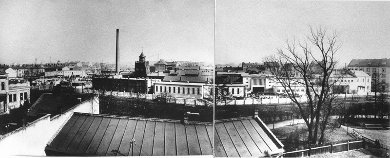 Celkový pohled na areál jatek po přestavbě. Zcela vlevo dobytčí trh, dále budovy porážek a ledárny, průčelí kancelářské budovy, zcela vpravo sprchové lázně, kolem r. 1930