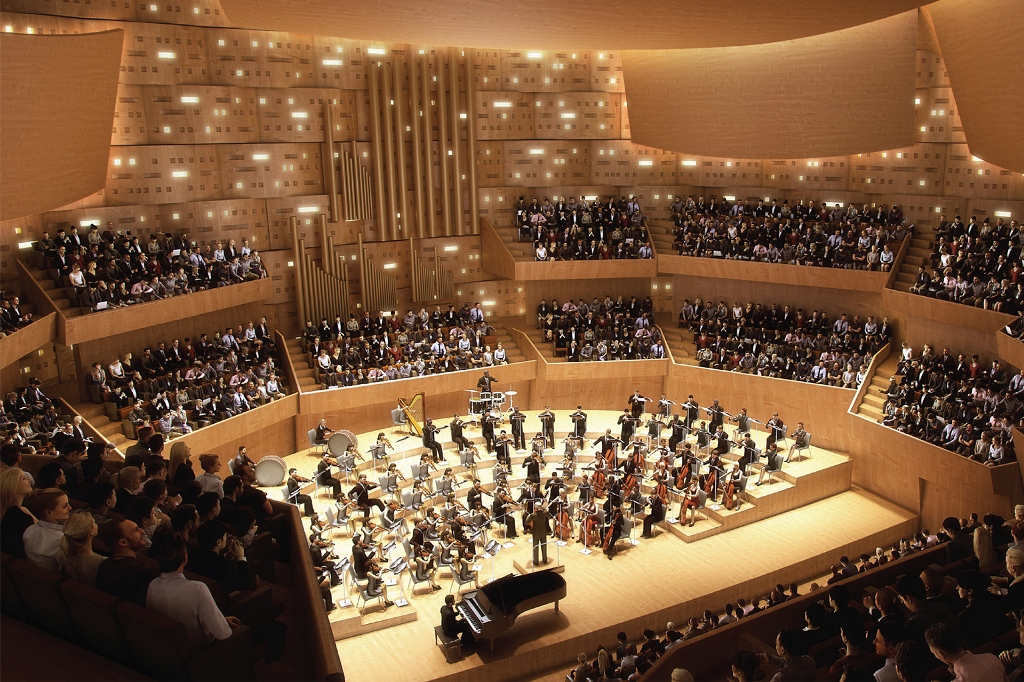Architektonická soutěž na koncertní halu byla koncipována jako kombinovaná se dvěma koly. Účast v ní deklarovaly tři mezinárodně uznávané architektonické kanceláře se zkušenostmi s projektováním koncertních síní, k nimž odborná porota vybrala z 31 zájemců další tři renomované architektonické kanceláře.