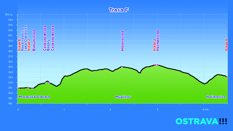 Začátek dokončeného úseku trasy F je u lávky přes Ostravici na jižním konci Komenského sadů u křížení trasy E. Trasa vede přes ul. Bohumínskou na sídliště Kamenec k ul. U Staré Elektrárny a podél domova důchodců u trolejbusové smyčky Bazaly (veďte kolo) na ul. Bukovanského, Křížkovského, U Kapličky (nová stezka mezi ul. Křížkovského a poštou) a Staré Podolí. Trasa směrem na Heřmanice pokračuje v ul. Na Úbočí, Sodná a Koněvova až k napojení na trasu V, přičemž v posledním úseku si můžete vybrat ze dvou paralelních tras (Koněvova nebo Parcelní).