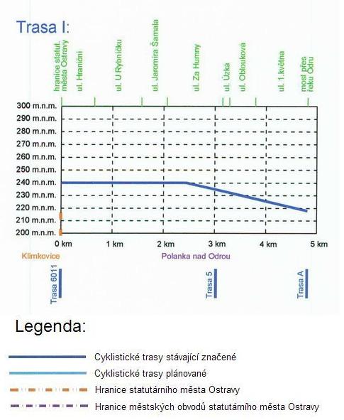 Popisovaný úsek trasy začíná na hranici Klimkovic a Polanky v blízkosti restaurace Verdun (na klimkovické straně propojení po ul. Hraniční na trasu 6011 vedoucí přes Olbramice a Bílovec do Studénky). Trasa I vede po záhumenní cestě zrekonstruované v severní části tohoto cípu Polanky a po ul. Skotnice a Na Rybníčku míří ke středu obce. Po ul. Janovské a J. Šámala vede trasa opět na severní záhumenní cestu (ul. Za Humny) a napojuje se na Jantarovou stezku. Po krátkém souběhu trasa pokračuje ul. Úzkou a Obloukovou (pozor v opačném směru je jiný průběh trasy) k ul. K Pile, odkud trasa vede po ul. 1. Května na Honculu. Dokončen byl dělený úsek cyklistické stezky od železniční zastávky Polanka nad Odrou k mostu přes Odru. Přes most vchází trasa do Staré Bělé. V tomto úseku je nutno věnovat jízdě zejména v letních měsících zvýšenou pozornost (hrozí kolize pěších, cyklistické a motorové dopravy). Trasa je dále vedena podél ul. Na Lukách stezka pro chodce a cyklisty až do křižovatky s ul. Proskovickou, kde je ukončena.