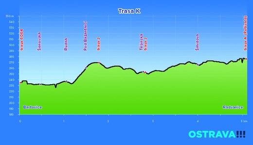 Trasa K má svůj počátek v křižovatce ulic Pod Tratí a Na Pasekách v lokalitě Václavek v Bartovicích. Do tohoto bodu se cyklista může dostat např. od železniční stanice v Bartovicích po trase 6064. Trasa K vede ul. U Důlňáku, Šenovskou a Pod Bažantnicí ke statku, odkud je při dobrém počasí pěkný výhled na Beskydy. Ul. Dvorovou a Za Ještěrkou směřuje trasa k Bartovickému lesu, do nějž vchází po ul. U Pramenů a Majovského. Lesní cestou míří trasa k vyústění na ul. Šmídovu a kolem areálu bývalého dolu Fučík III přechází na území Petřvaldu, odkud je značená místním značením písmenem "A" až do Orlové.